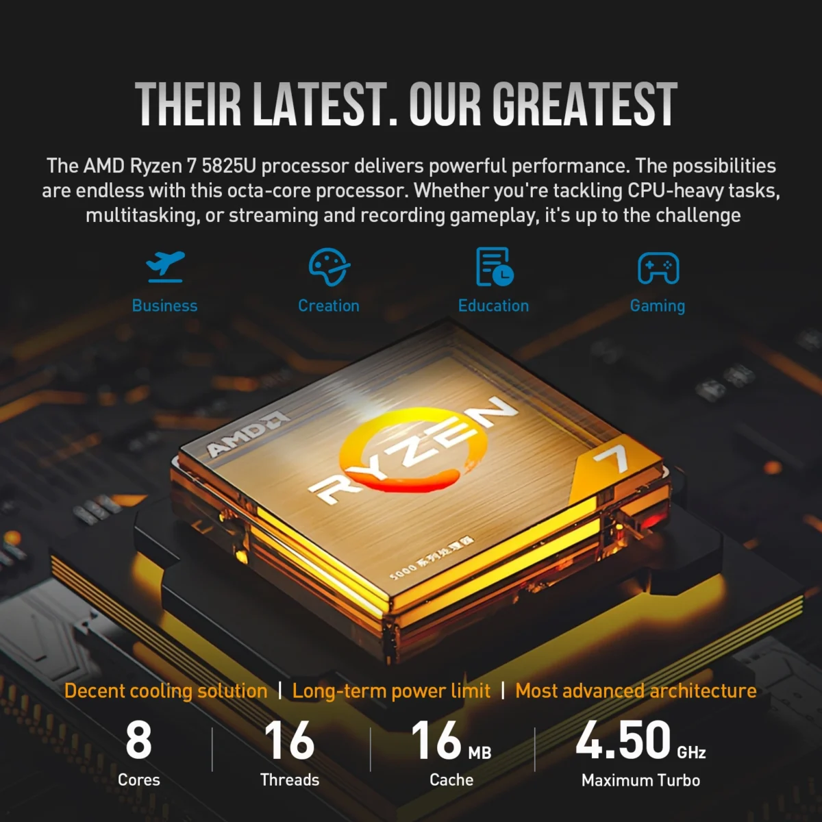 Octa-Core Ryzen 7 5825U Processor (2.0GHz base frequency, up to 4.5 GHz, 16MB L3 Cache 16 Threads) – powerful and best for fast multitasking and heavy workloads. Adaptive thermals keep the PC running smoothly and cool, using advanced algorithms and accelerometers