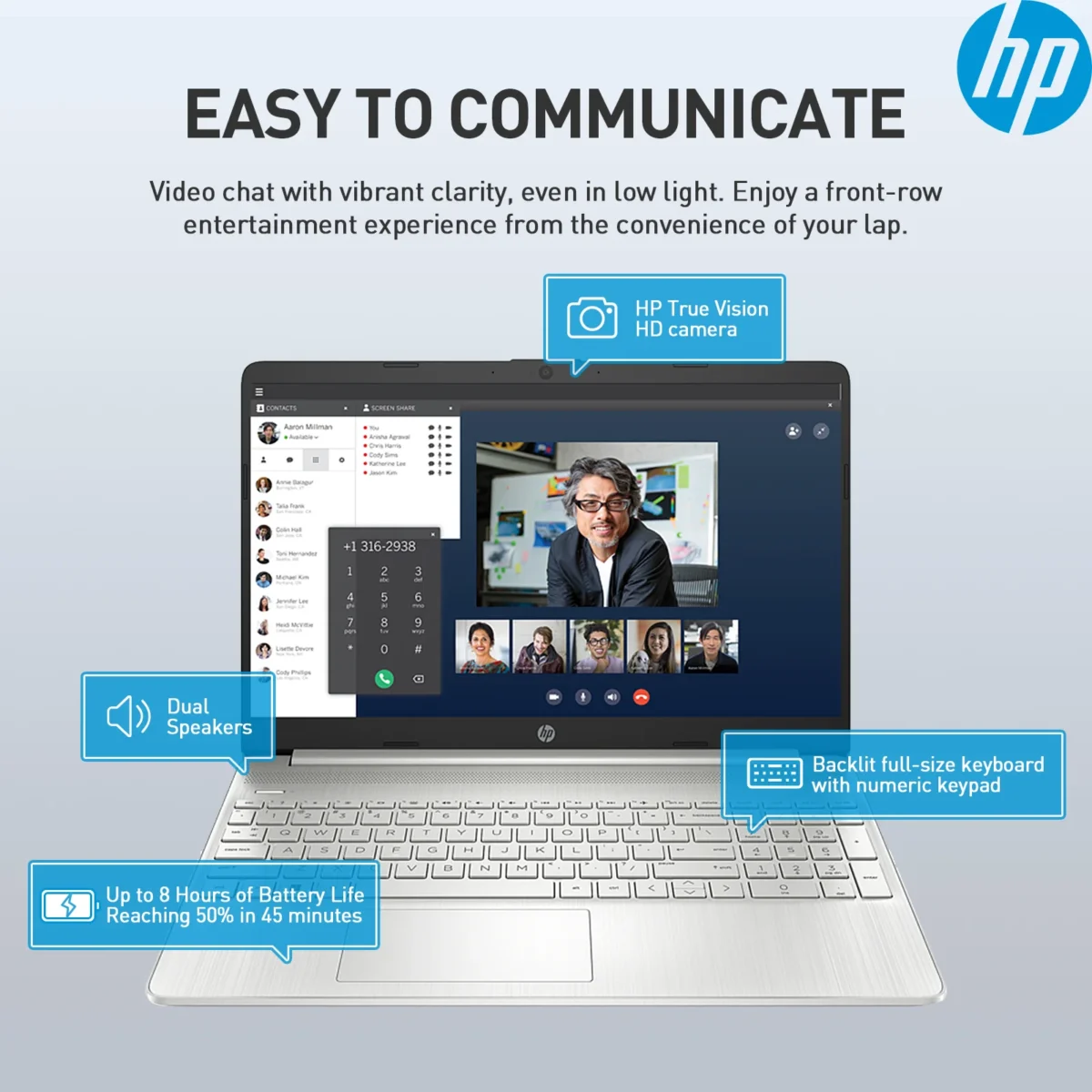 Up to 8-hour long battery + HP Fast Charge (50% charge in 45mins) – Work, stream, game nonstop